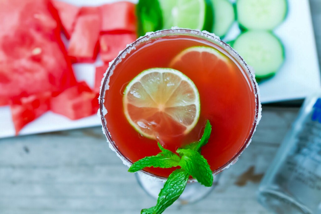 - Stir in lime juice to watermelon and cucumber juice, along with vodka.